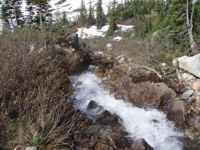 almost out of snow. Creek in full flood